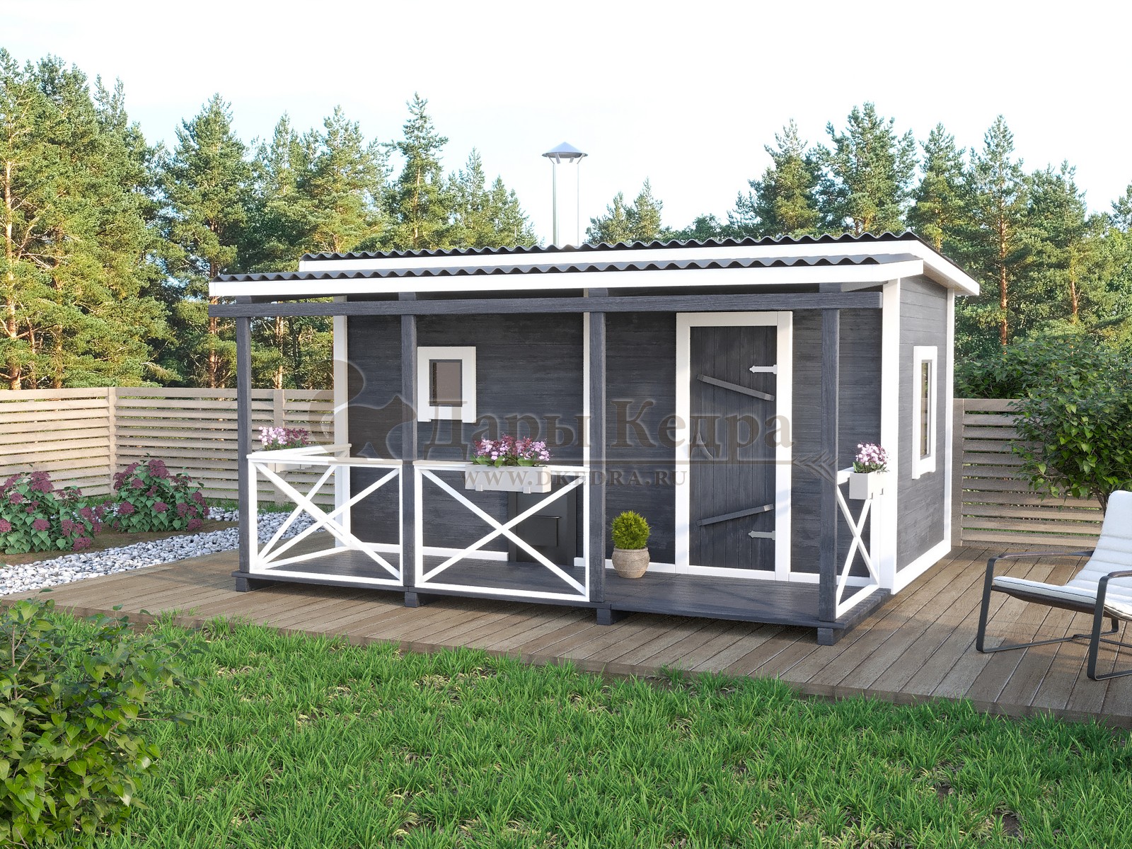 Каркасно-щитовая баня из кедра «Сканди» с верандой Это классическая прямоугольная модель бани с двумя отделениями: предбанником и парилкой, а так же удобной терассой. Предбанник оснащен лавочкой и вешалкой. Парилка оборудована двухуровневым открытым полком и печью. Время растопки такой бани не превышает 30 минут. Каркасно-щитовую баню можно заказать как в готовом, так и в разборном варианте. В разборной модели готовые щиты из кедра быстро собираются в полноценное строение, что также позволяет исключить лишний строительный мусор. Такая баня не требует полноценный фундамент, поэтому при необходимости ее можно перенести в другое место. Древесина кедра насыщена эфирными маслами и фитонцидами, которые активируются при воздействии температур. Таким образом, парение в каркаско-щитовых банях из кедра становится еще полезнее.