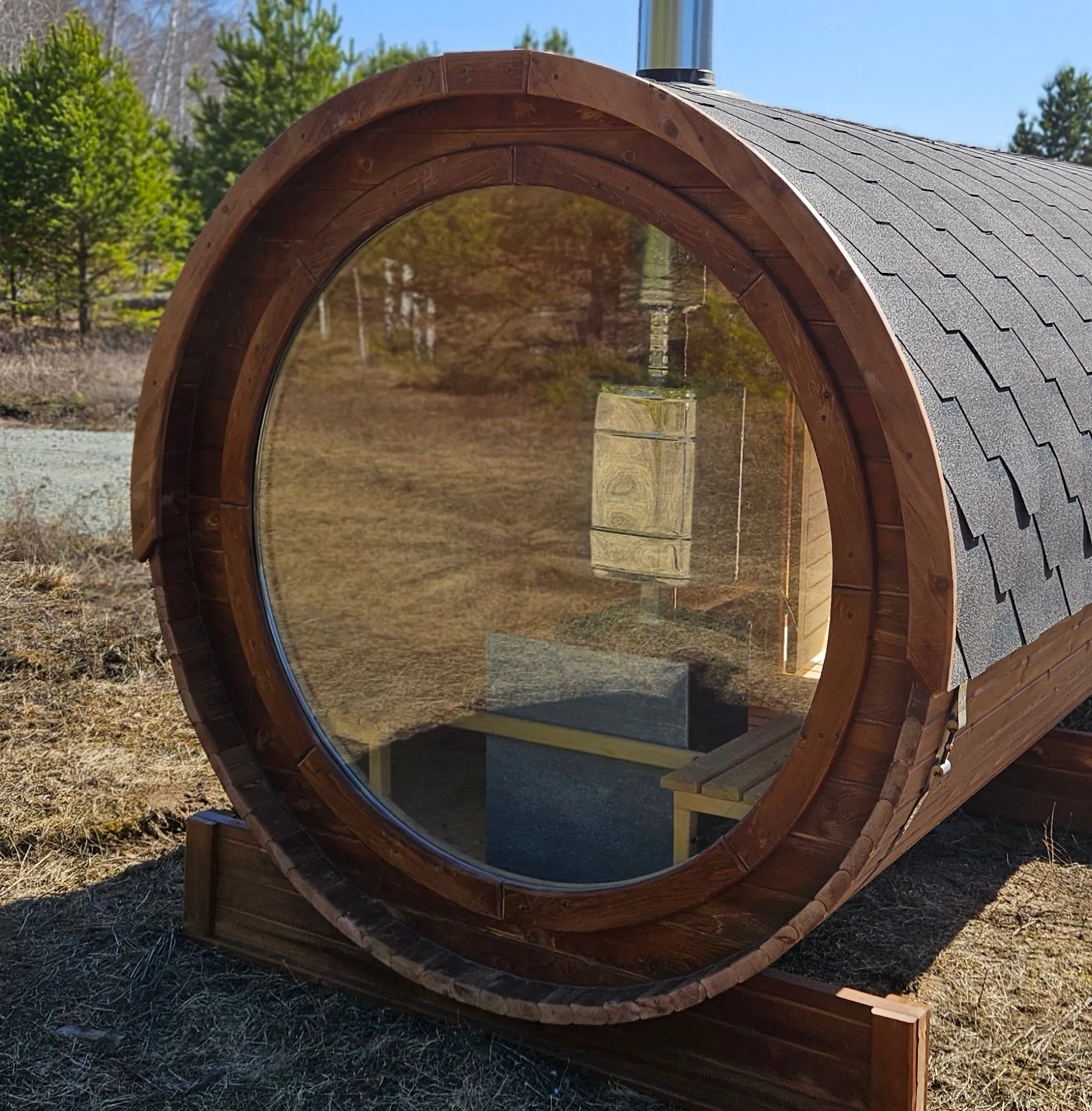 Боковой вход у такой модели находится в начале или в середине конструкции. В увеличенные модели можно повесить полочки и вешалки из кедра. Время растопки такой бани не превышает 30 минут. По вашему желанию баню-бочку можно дополнить печью с внешней загрузкой, благодаря которой весь мусор после топки останется на улице. Круглая баня-бочка не требует полноценный фундамент, поэтому при необходимости ее можно перенести в другое место.