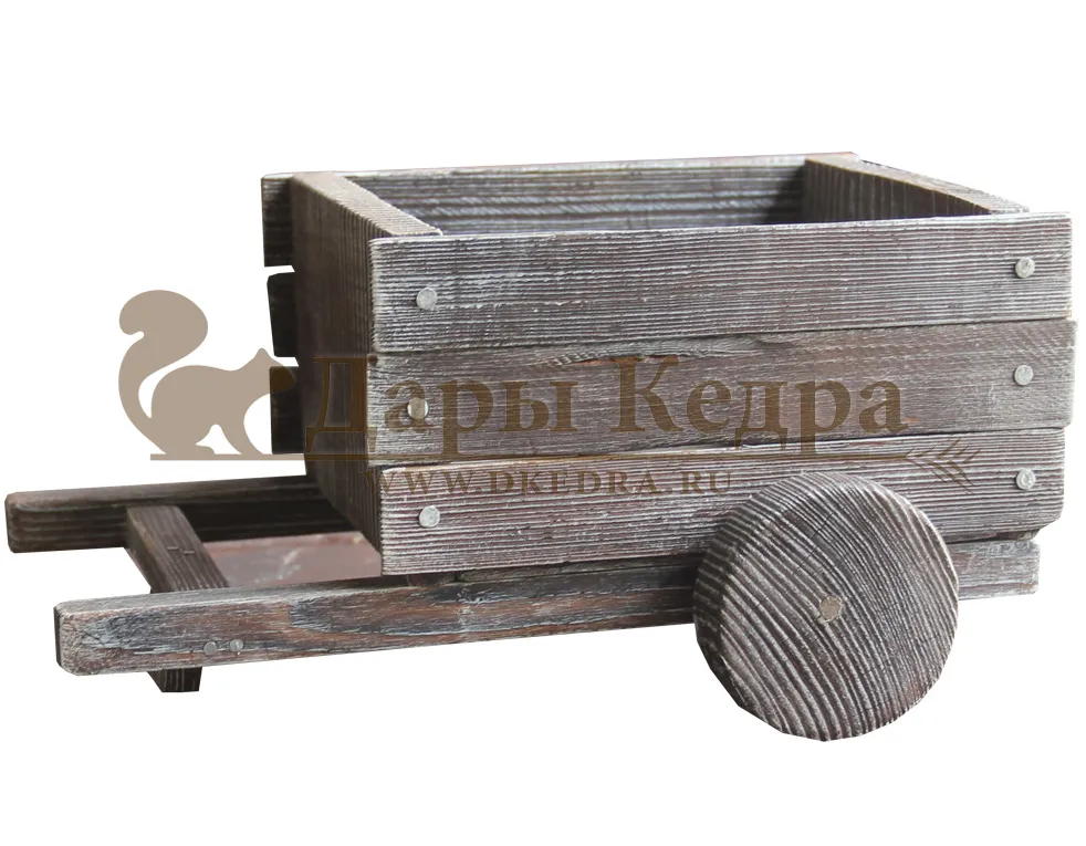Деревянная тележка Компания Дары Кедра изготавливает деревянные ящики, машинки, тачки, которые подойдут в качестве украшения любому интерьеру гостиной, кухни, детской комнаты. Они могут быть использованы в качестве конфетницы, вазы для фруктов, а также оригинальной упаковки подарка любимому человеку, ребенку, коллеге.