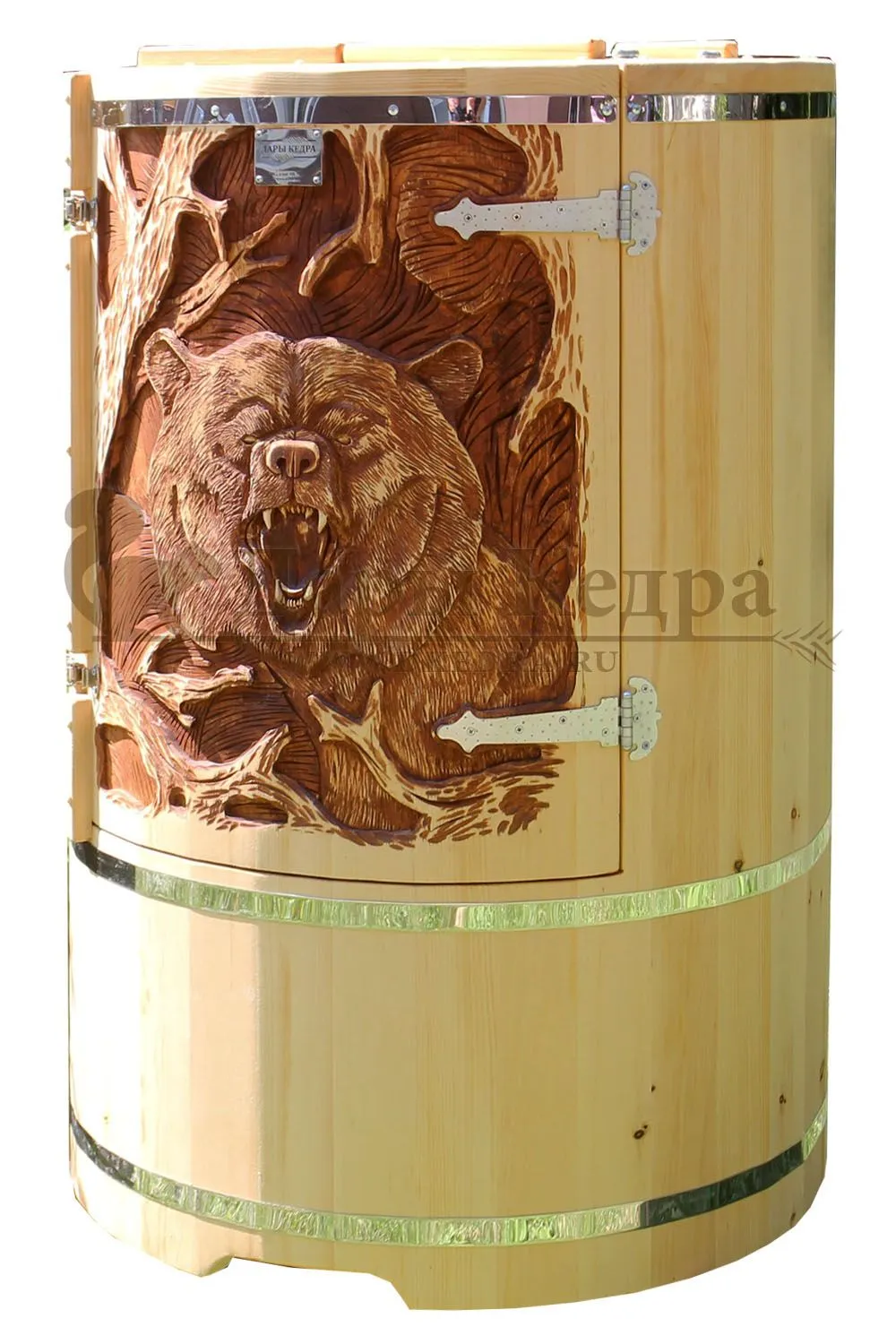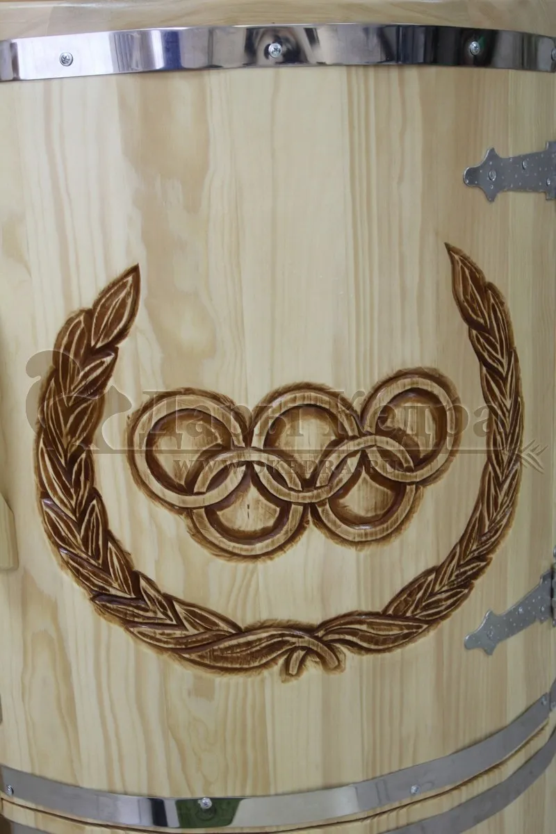 • Кедровая бочка (фитобочка) «Олимпийский чемпион» Это эксклюзивная фитобочка любой модели и комплектации с резьбой вашего логотипа или фирменного знака. Просто приготовьте эскиз рисунка, и наши мастера перенесут его на изделие. Авторский рисунок на фитобочек придаст оригинальность вашему дому или салону красоты, подчеркнёт вашу индивидуальность и непревзойденный вкус. Художественная резьба это ручная работа, выполняется разными мастерами и каждый рисунок неповторим. Вы можете выбрать предложенные варианты резьбы или подобрать изображение и мы предложим вам подходящий эскиз. На сайте представлены наши работы в качестве примера. Каждая резьба рассчитывается индивидуально и может быть нанесена на любую модель фитобочки. Парение в фитобочке благотворно влияет на организм в целом: повышается иммунитет, выводятся шлаки и токсины, улучшается работа органов тела и состояние кожи. Обязательно обращайте внимание на размер дверных проемов вашего помещения. Если они меньше 78 см, то закажите разборную модель!
