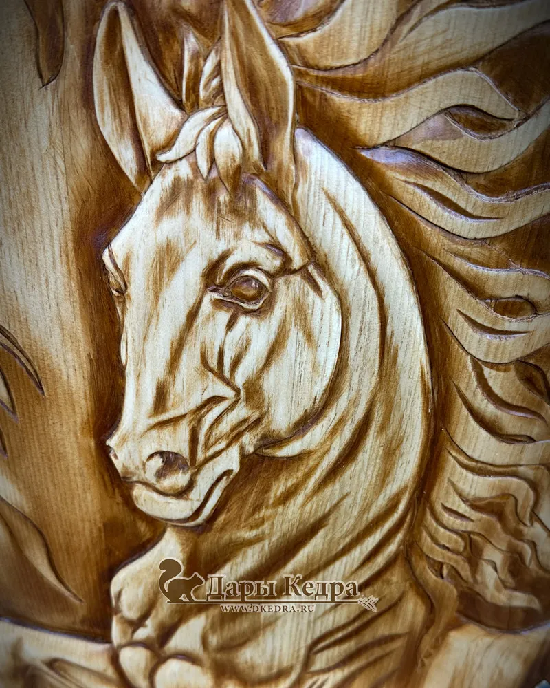 • Кедровая бочка (фитобочка) «Огненная лошадь» Любая модель эксклюзивной фитобочки - это выбор не только дизайнеров и ценителей красоты, но и тех, кто любит нестандартный подход в любых деталях. С оригинальной авторской фитобочкой Дары Кедра ваша квартира, дом или салон красоты станут объектом всеобщего внимания, ведь такая фитобочка - это не просто смело, красиво и достойно, это еще и очень полезно для Вашего здоровья! Художественная резьба это ручная работа, выполняется разными мастерами и каждый рисунок неповторим. Вы можете выбрать предложенные варианты резьбы или подобрать изображение и мы предложим вам подходящий эскиз. На сайте представлены наши работы в качестве примера. Каждая резьба рассчитывается индивидуально и может быть нанесена на любую модель фитобочки. Эксклюзивная фитобочка может быть представлена в разной цветовой гамме: После того, как цвет фитобочки выбран, необходимо определиться с вариантом резьбы (или предложить свой): Фитобочку можно также декорировать канатной веревкой в места обручей из нержавеющей стали (оплачивается дополнительно).