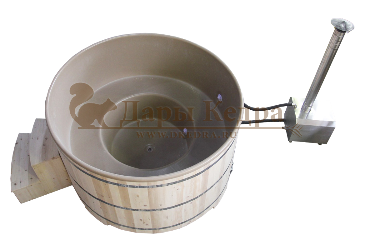 Это уличная подогреваемая купель с круглой внутренней чашей из термопластика, которая имеет цельную форму вместе с сиденьями и дном. Для удобства пользования купель фурако оборудована приставной лестницей. Подогрев воды осуществляется за счет внешней печи с дымоходом. Термопластик устойчив к воздействию температур, облегчает уход за фурако и увеличивает срок ее службы.